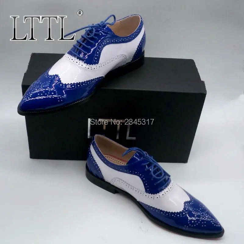 New Fashion Mens Pointed Toe Dress Shoes Blue And White Mixed Colors Patent Leather Oxfords Full Br